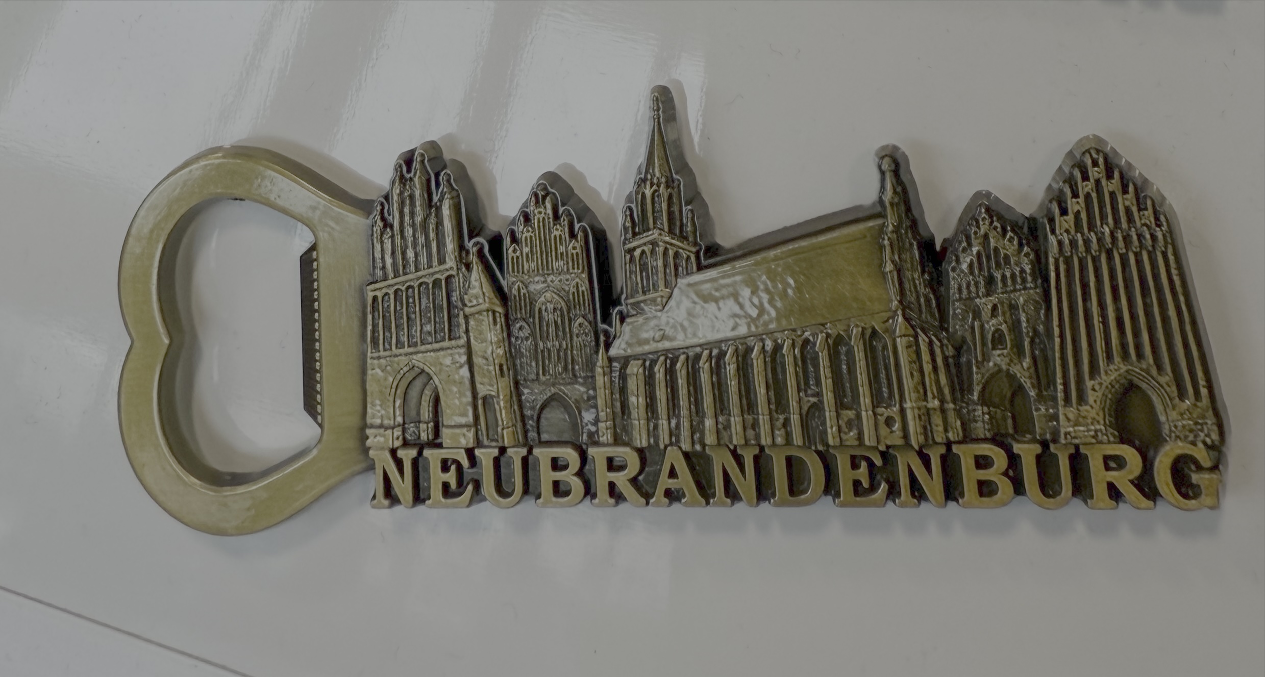 Entdecken Sie Neubrandenburg auf stilvolle und praktische Weise mit unserem exklusiven 2-in-1 Flaschenöffner mit integriertem Kühlschrankmagneten in elegantem Goldton (Messing). Dieses hochwertige Souvenir vereint Funktionalität und Design – ein echter Hingucker und gleichzeitig ein Stück Stadtgeschichte zum Anfassen!