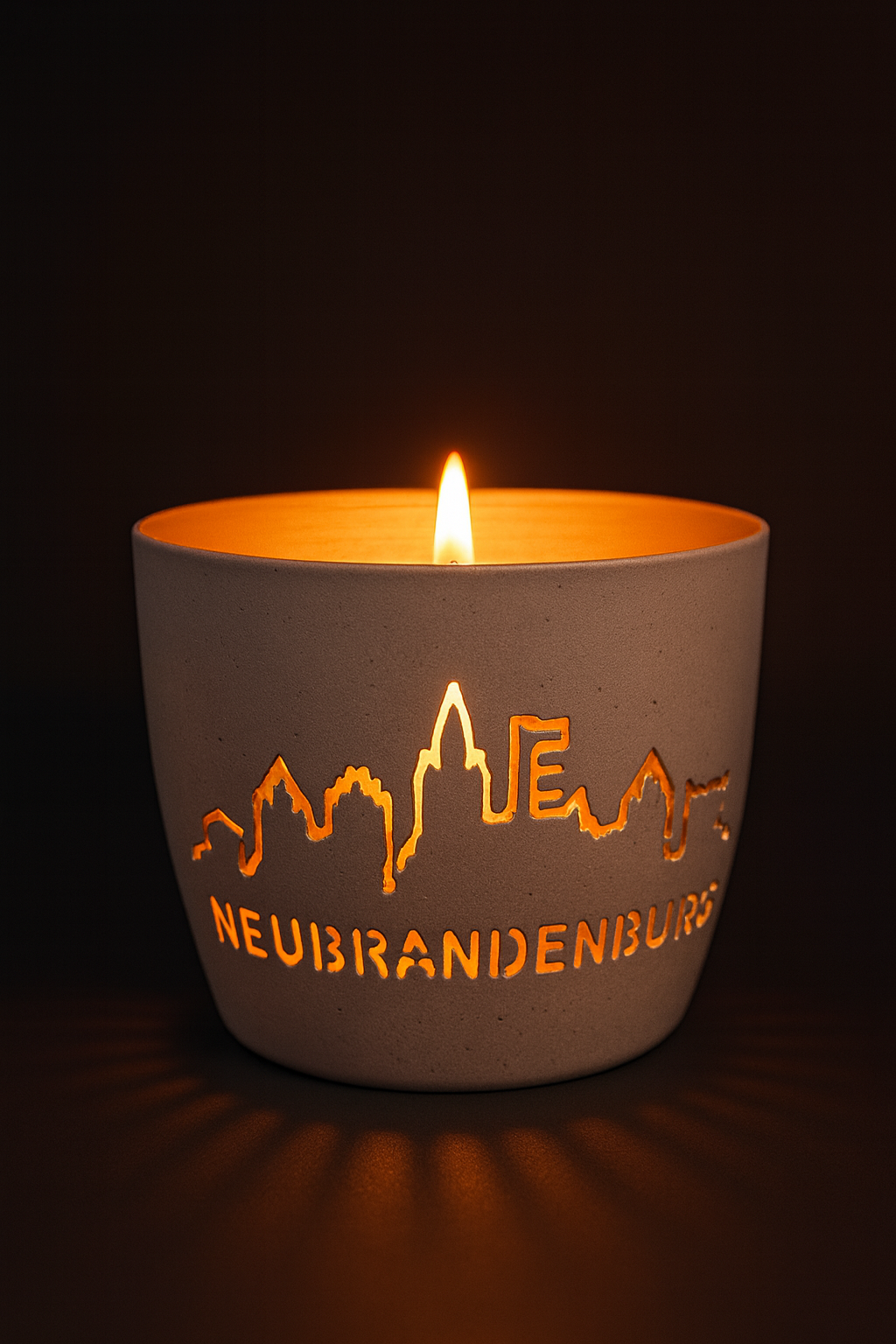 Das hochwertige Windlicht mit der Neubrandenburger Skyline verbindet modernes Design mit liebevollen Details. Die kunstvolle Silhouetten-Aussparung zeigt die markanten Konturen der Stadt – ein besonderes Highlight für alle Neubrandenburg-Fans, Heimatverbundene und stilvolle Dekoliebhaber.
